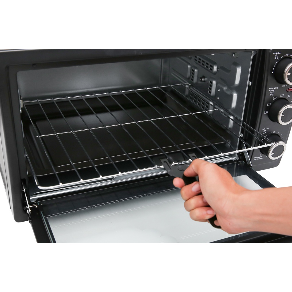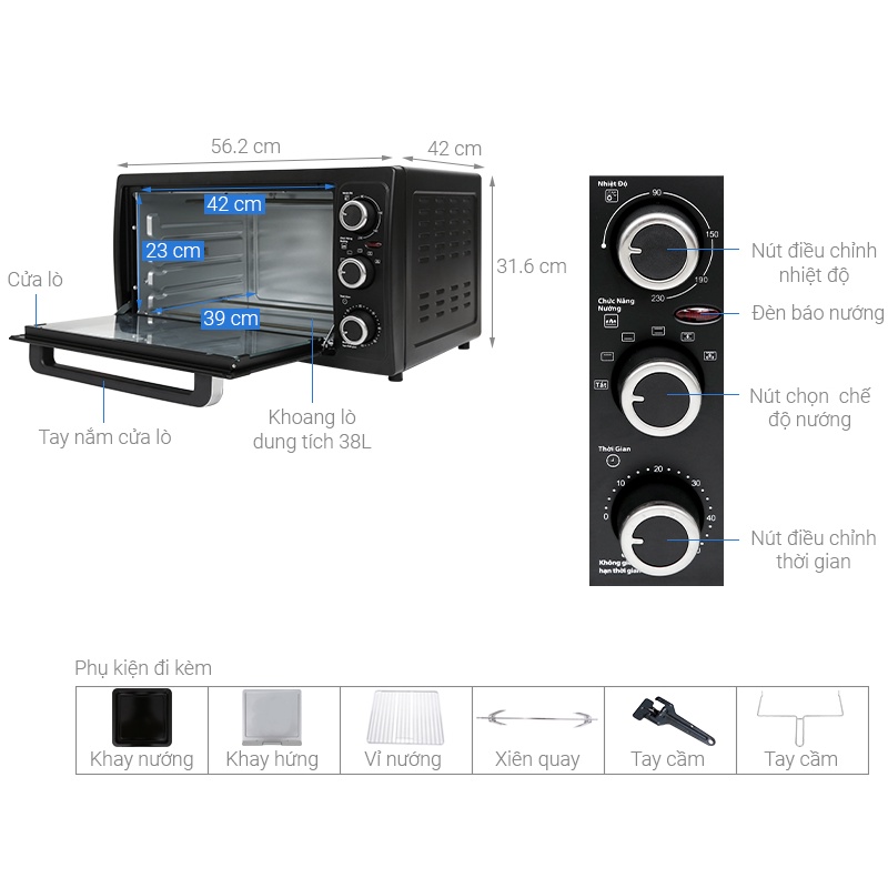 Dung tích 38 lít đủ rộng để nướng gà nguyên con dưới 1.5 kg, 1 ổ bánh bông lan tầm 22 cm...