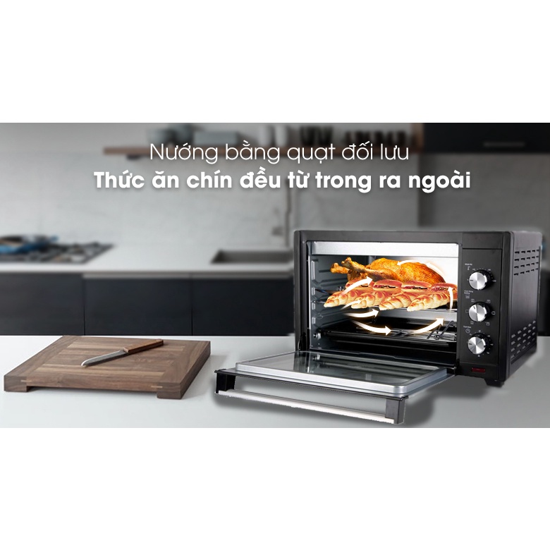 Công suất 2000 W, công nghệ làm nóng điện trở làm lò nóng nhanh kết hợp với quạt đối lưu luân chuyển nhiệt lượng đều khắp khoang lò nướng đa năng cho thức ăn chín nhanh, ngon từ trong ra ngoài