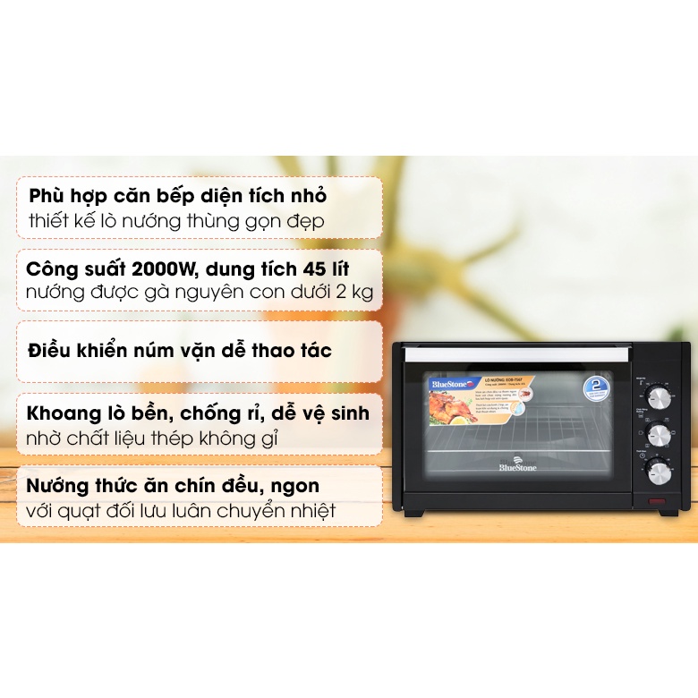 Lò nướng Bluestone EOB-7567 45 lít chất lượng tốt, mẫu đẹp, nướng chín thức ăn ngon, nhanh, giá tiêu dùng tốt.