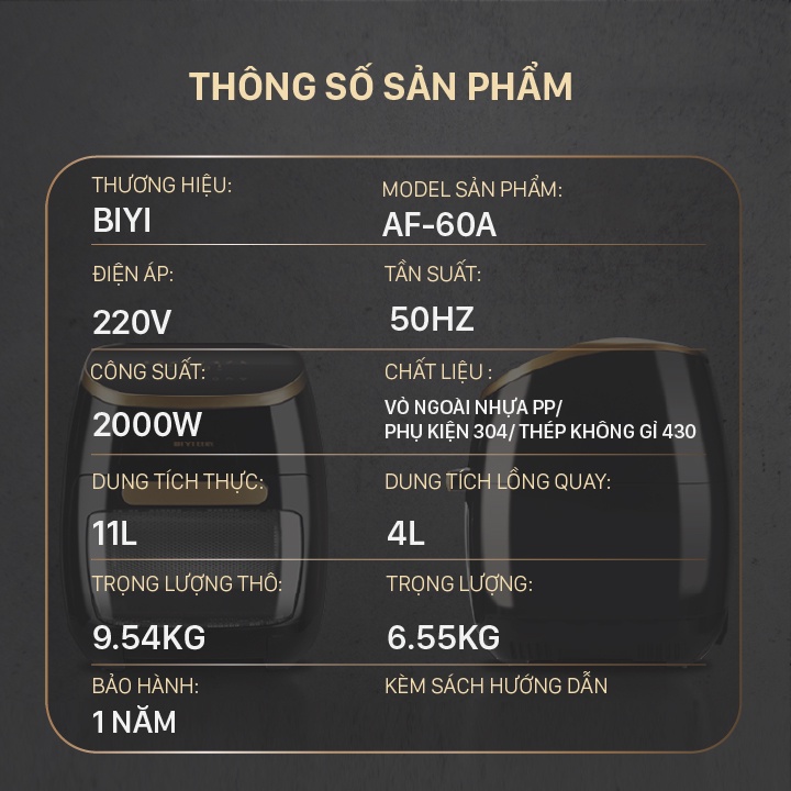 Lò nướng chân không BIYI AF-60A 11l 2000W - Đa chức năng - Bảo hành 12 thángĐẶC TÍNH NỔI BẬT CỦA SẢN PHẨM: