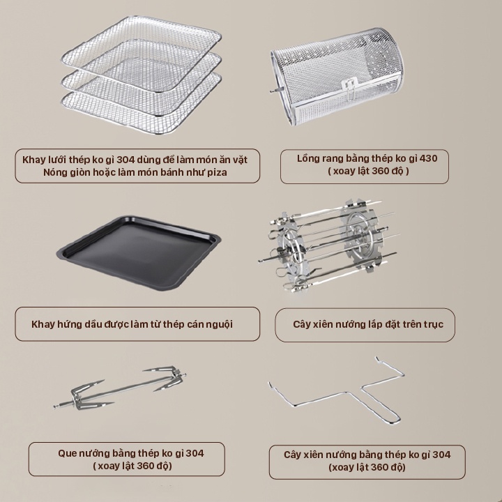 - Với dung tích lớn cải tiến 11L, 3 ngăn khay lưới bằng thép không gỉ 304 bạn có thể nấu 1 lần 3 món. Vượt trội hơn so với các lò nướng thông thường.