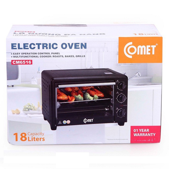 - Lò nướng điện 18 lít Comet CM6516 chuyên dụng để nướng bánh. Đặc biệt là làm nóng hay làm giòn vỏ bánh mì hay bánh mì sandwich, hay dùng hâm nóng bánh pizza. Tuy kích thước nhỏ, công suất 1300 W, nhưng lò có thể dùng để hâm nóng, rã đông thức ăn, nướng gà, vịt nguyên con, thịt bò,heo, đều có thể cho vào vừa vặn trong lò.