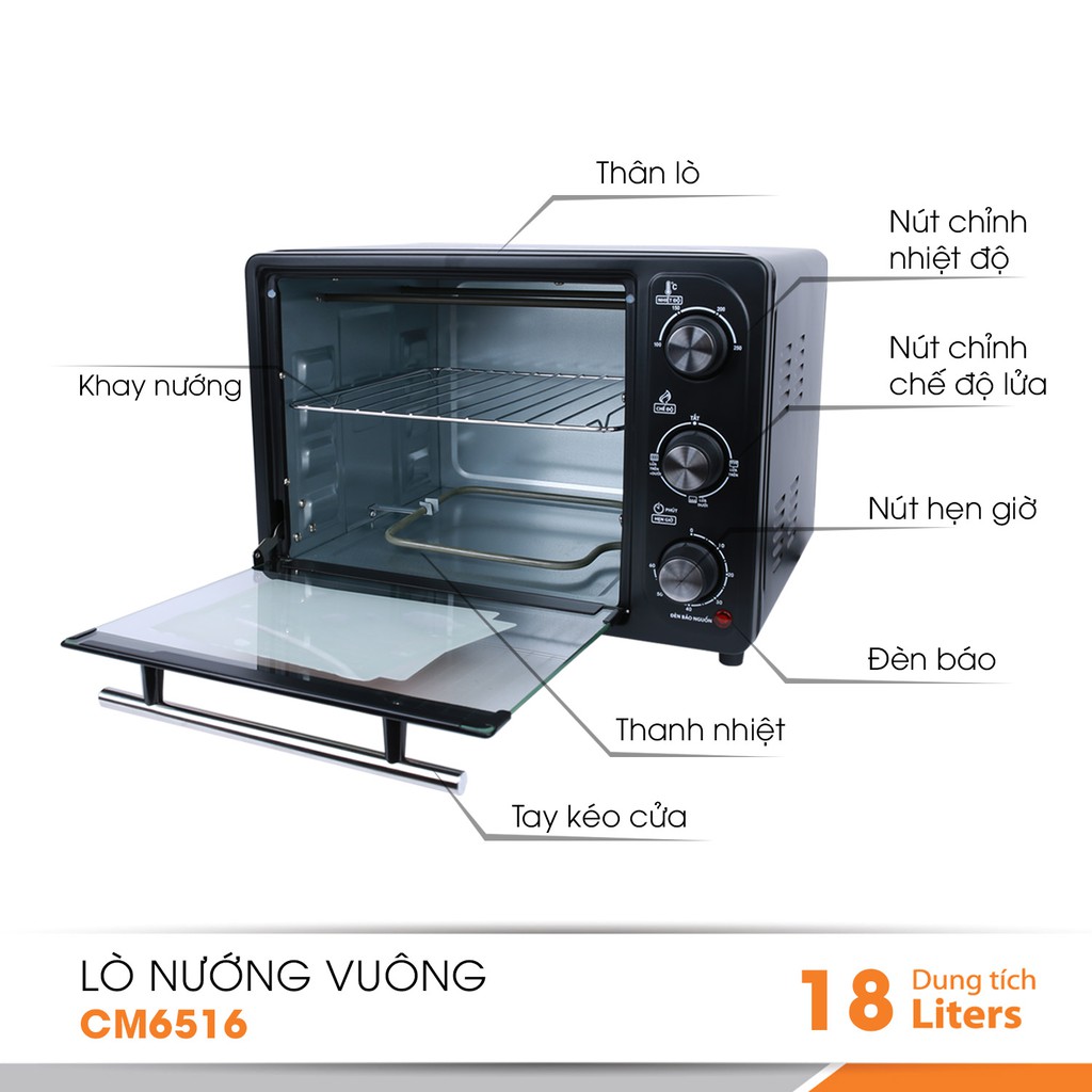 - Lò nướng điện đa năng CM6516 có dung tích lớn 18L, giúp bạn có thể rã đông hay nướng nhiều thực phẩm trong 1 lần nhằm tiết kiệm tối đa thời gian và điện năng tiêu thụ.