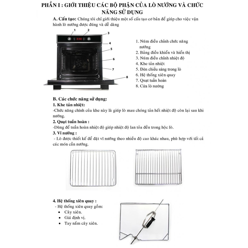 Lò nướng âm tủ nướng tuần hoàng: Tuần hoàn nhiệt giúp nhiệt phân bổ đều trong buồng nướng, bảo đảm thức ăn chín vàng đều. Với chức năng này thức ăn khi nướng nhiều loại sẽ không bị mất mùi và trộn lẫn hương vị.