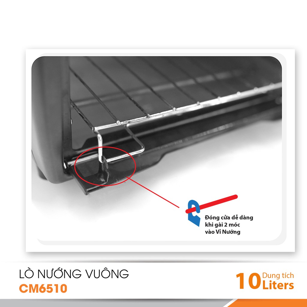 - Lò nướng đa năng CM6510 có dung tích vừa đủ 10L, phụ kiện đi kèm : khay hứng dầu, vỉ nướng.