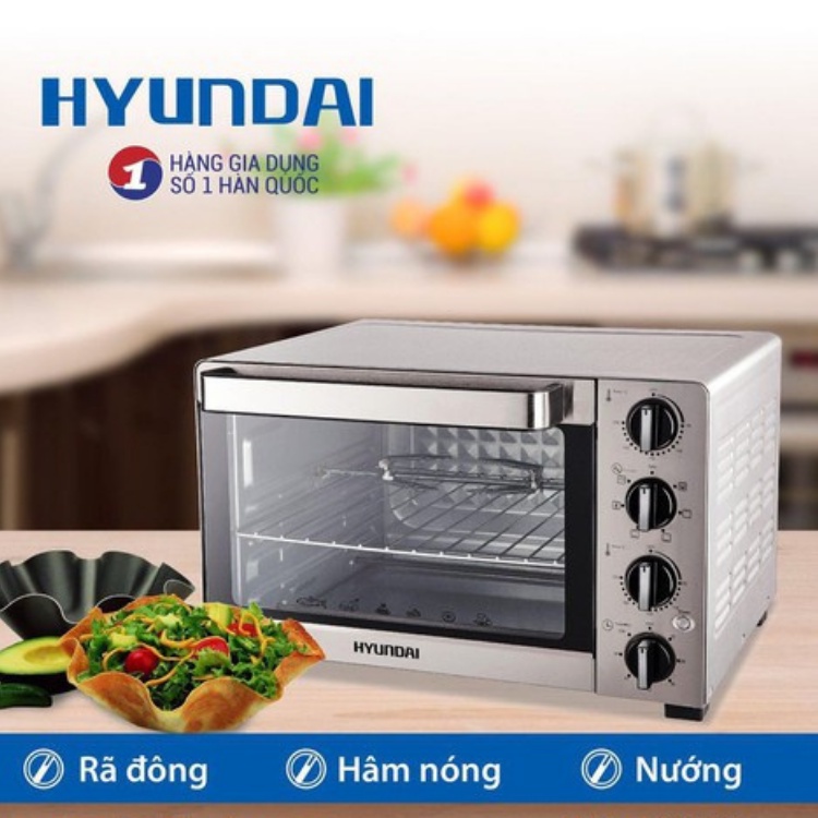 Sản phẩm chăm sóc nhà bếp Hyundai mang đến thành công không chỉ bởi khả năng hỗ trợ công việc nấu nướng mà còn bằng sự hiểu biết sâu sắc về nhu cầu ẩm thực và bày trí không gian nhà bếp của khách hàng. Bằng chức năng nướng xiên quay và quạt đối lưu phân bố nhiệt đều khắp buồng nướng, lò nướng Hyundai giúp món nướng chín rất đều và vàng ươm một cách tự động trong lúc bạn chuẩn bị nước chấm. Bên cạnh đó, với dung tích buồng nướng 45 lít cùng công suất 2000W, lò nướng Hyundai không chỉ cho phép nướng hầu hết các loại thịt từ bò, gà đến cá mà còn nướng được bánh Pizza, khoai tây và nhiều loại bánh khác.THÔNG SỐ KĨ THUẬT: