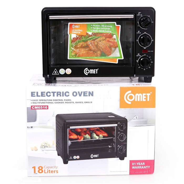 - Lò nướng điện 18 lít Comet CM6516 chuyên dụng để nướng bánh. Đặc biệt là làm nóng hay làm giòn vỏ bánh mì hay bánh mì sandwich, hay dùng hâm nóng bánh pizza. Tuy kích thước nhỏ, công suất 1300 W, nhưng lò có thể dùng để hâm nóng, rã đông thức ăn, nướng gà, vịt nguyên con, thịt bò,heo, đều có thể cho vào vừa vặn trong lò.