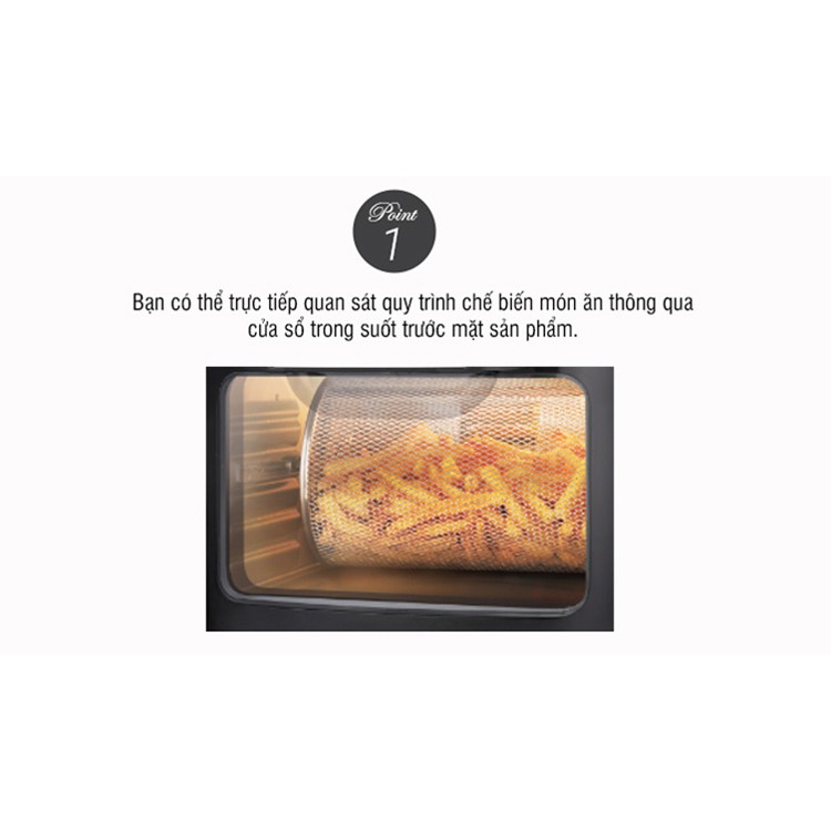 - Sản phẩm làm chín thực phẩm bằng các luồng khí nóng thay vì dầu nóng, giúp bạn chế biến món ăn lành mạnh hơn. - Sản phẩm còn được trang bị bộ lọc mùi và khói. Là sự tổng hợp của nhiều thiết bị và dụng cụ nấu nướng, với bộ hẹn giờ kỹ thuật số được tích hợp chế độ tự động tắt.