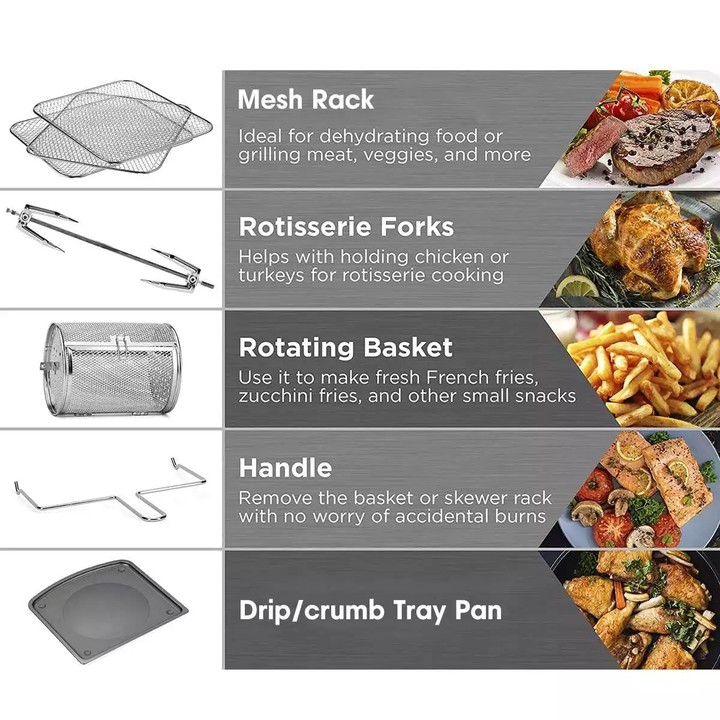 - Sản phẩm làm chín thực phẩm bằng các luồng khí nóng thay vì dầu nóng, giúp bạn chế biến món ăn lành mạnh hơn. Sản phẩm còn được trang bị bộ lọc mùi và khói. Là sự tổng hợp của nhiều thiết bị và dụng cụ nấu nướng, với bộ hẹn giờ kỹ thuật số được tích hợp chế độ tự động tắt.