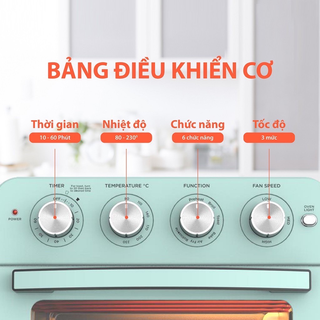 - Setup sẵn 6 chức năng chính: Preheat ( làm nóng), Broil (Nướng), Toast (Nướng bánh mì), Bake (Nướng bánh), Air fry (Chiên không dầu), Rotisserie (Quay)