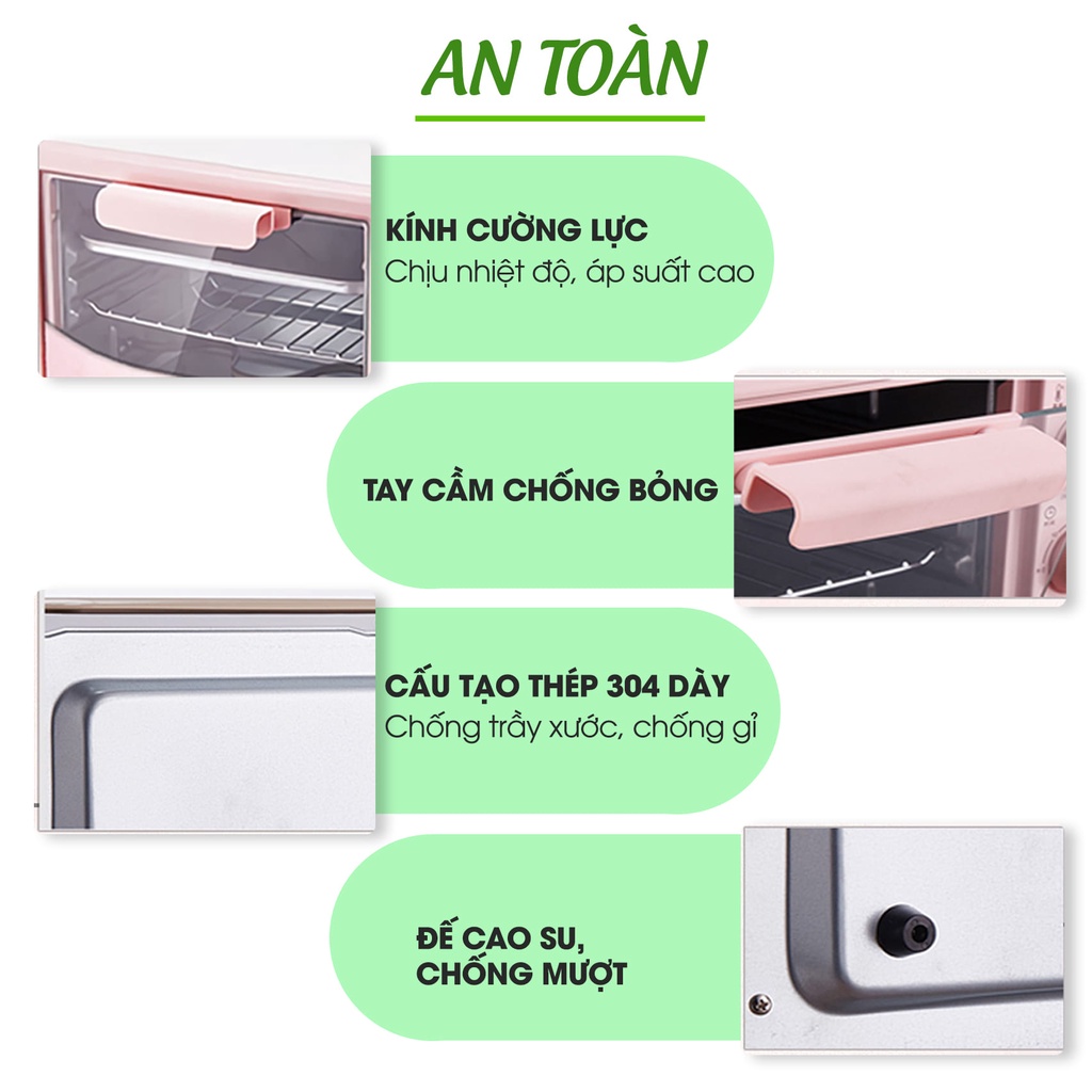 - Lò nướng cấu tạo từ kính cường lực chịu áp suất cao cùng tay cầm chống bỏng, đế cao su siêu an toàn