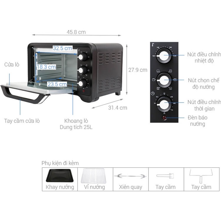Lò nướng Sanaky VH259S2D được trang bị núm vặn điều khiển với các chỉ dẫn dễ hiểu, ngay cả người lớn tuổi đều dễ dàng sử dụng lò. Đi kèm với lò là bộ khay nướng, xiên quay, vỉ nướng, tay cầm vỉ nướng, tay cầm xiên quay giúp hỗ trợ người dùng nấu nướng thuận lợi, nhanh chóng hơn.