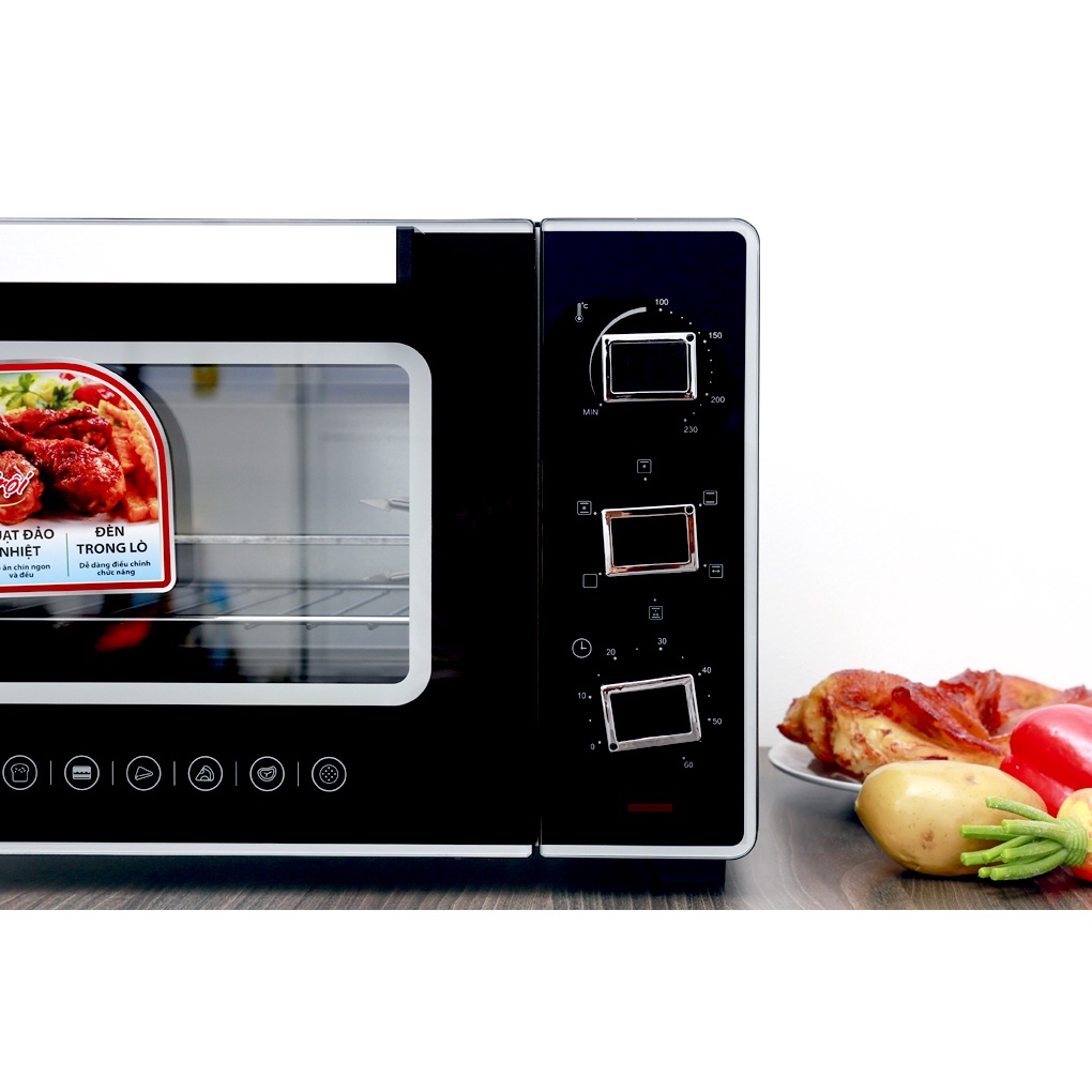 - Kích thước khoang lò cao 23 x rộng 36 x sâu 31.5 cm giúp bạn có thể nướng gà vịt khoảng 1.3 - 1.5 kg.