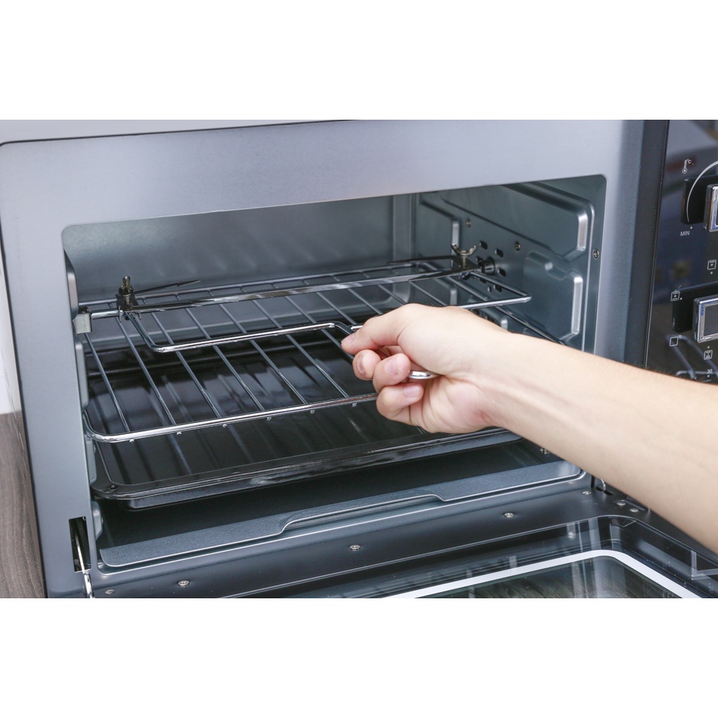 - Lò nướng đa năng với thiết kế quạt đối lưu giúp nhiệt độ tỏa đều khắp khoang lò, nhờ đó món nướng chín đều và ngon hơn.
