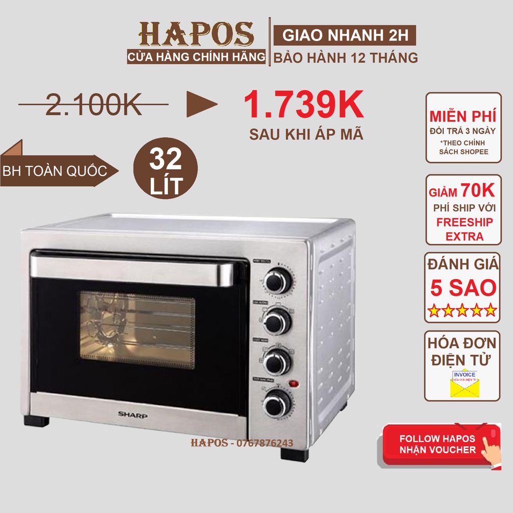 Thiết Bị Điện Gia Dụng > Đồ gia dụng nhà bếp > Lò nướng || Lò nướng Sharp 32 lít nướng đối lưu công suất 1500W chất liệu vỏ thép không gì điều khiển núm vặn - HAPOS Phân phốiCòn hàng
