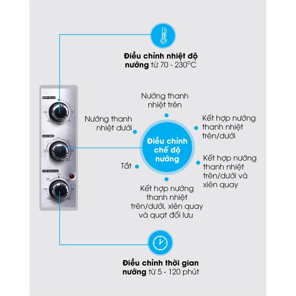 Chức năng chính:Làm giòn bánh, Nướng thực phẩm, Nướng bánh, Nướng gà nguyên con 1.5 kg trở xuống