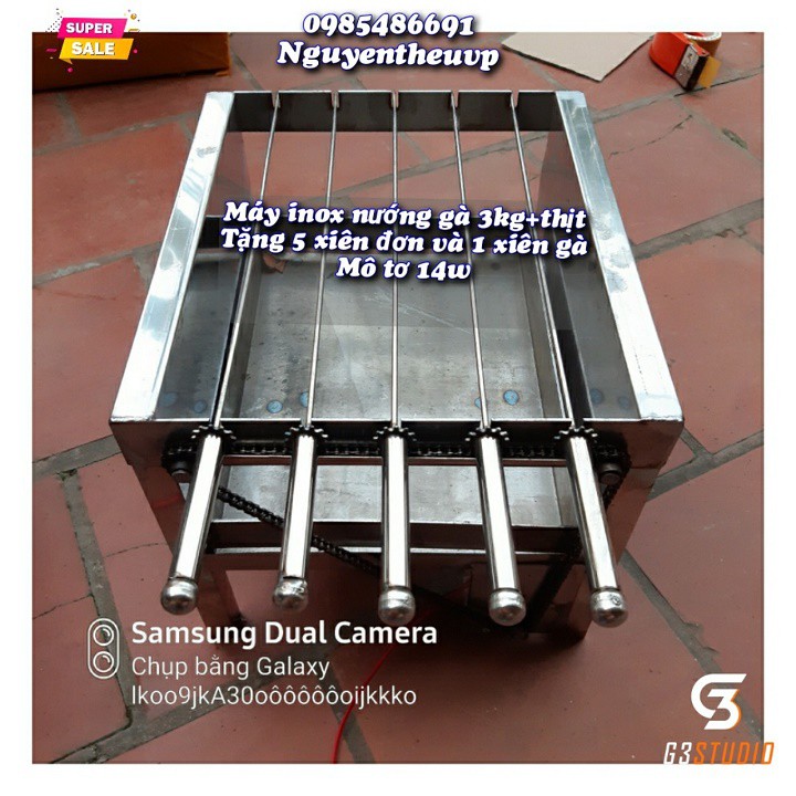 - Máy quay gà 3kg inox: Mô tơ 14w,khỏe hơn, quay gà to hơn, 3.5kg trở xuống.