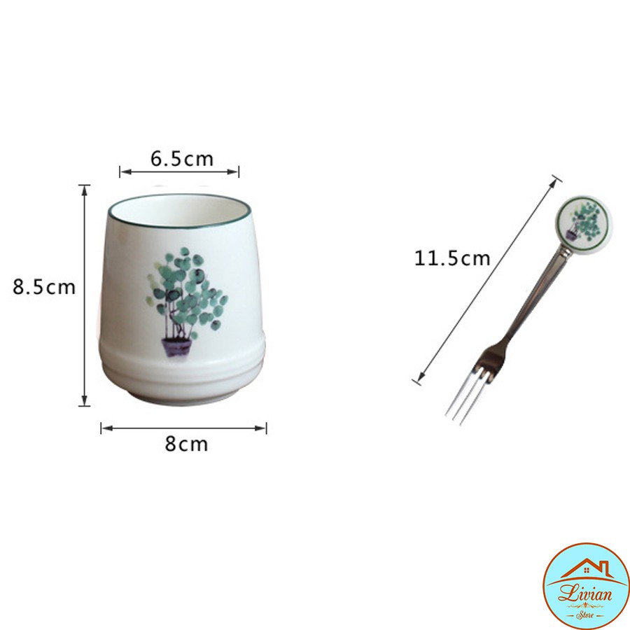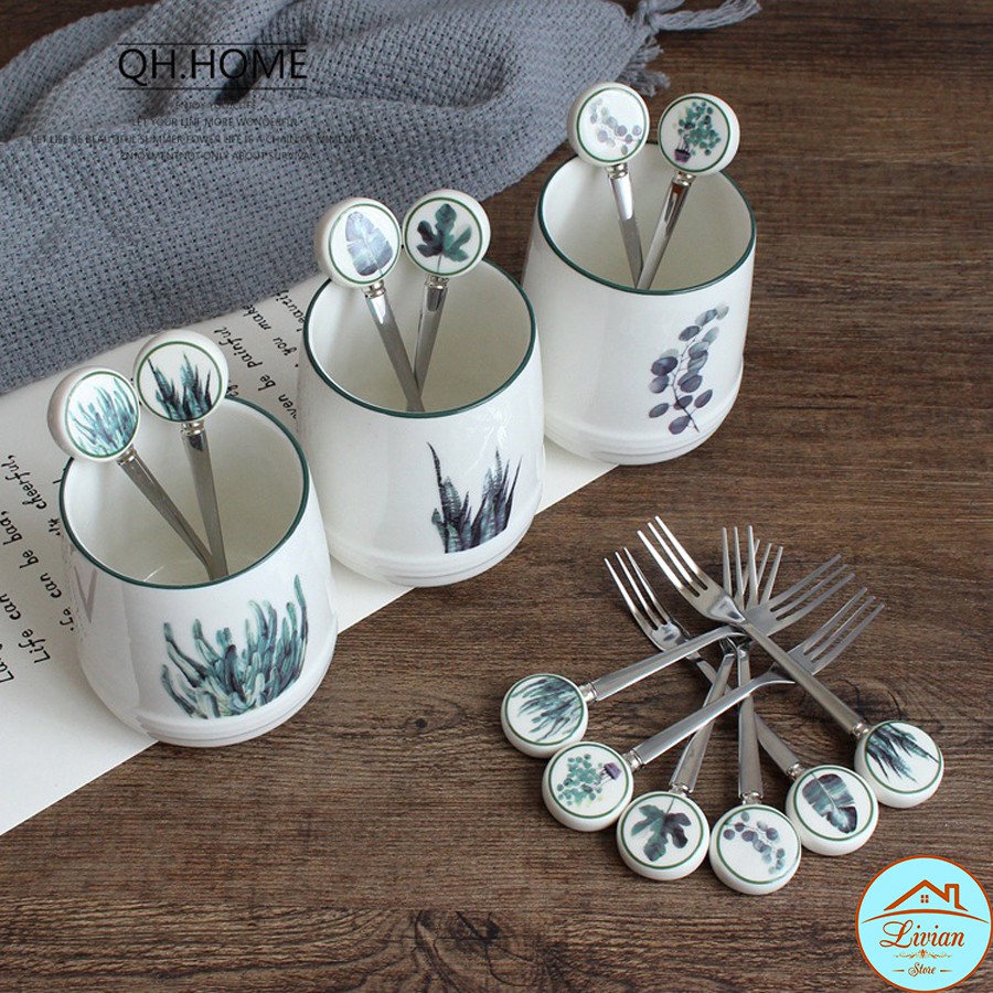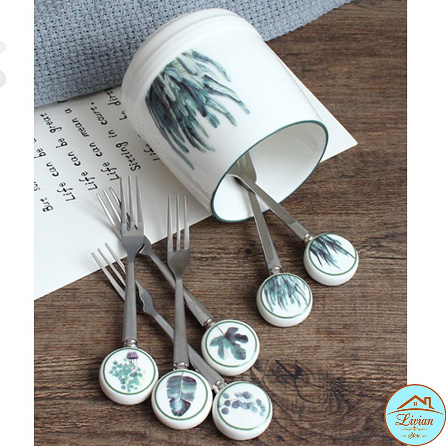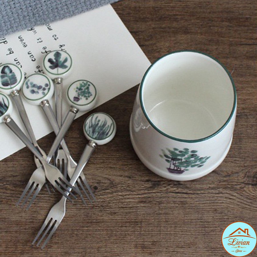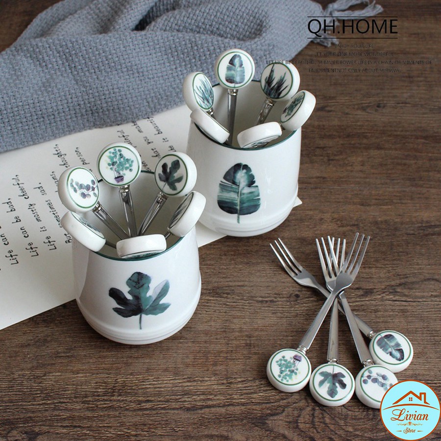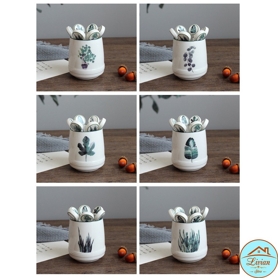 Nhà cửa & Đời sống > Bộ đồ bàn ăn > Dĩa || Lọ sứ đựng dĩa kèm 6 dĩa tráng miệng họa tiết cây lá xinh xắnCòn hàng