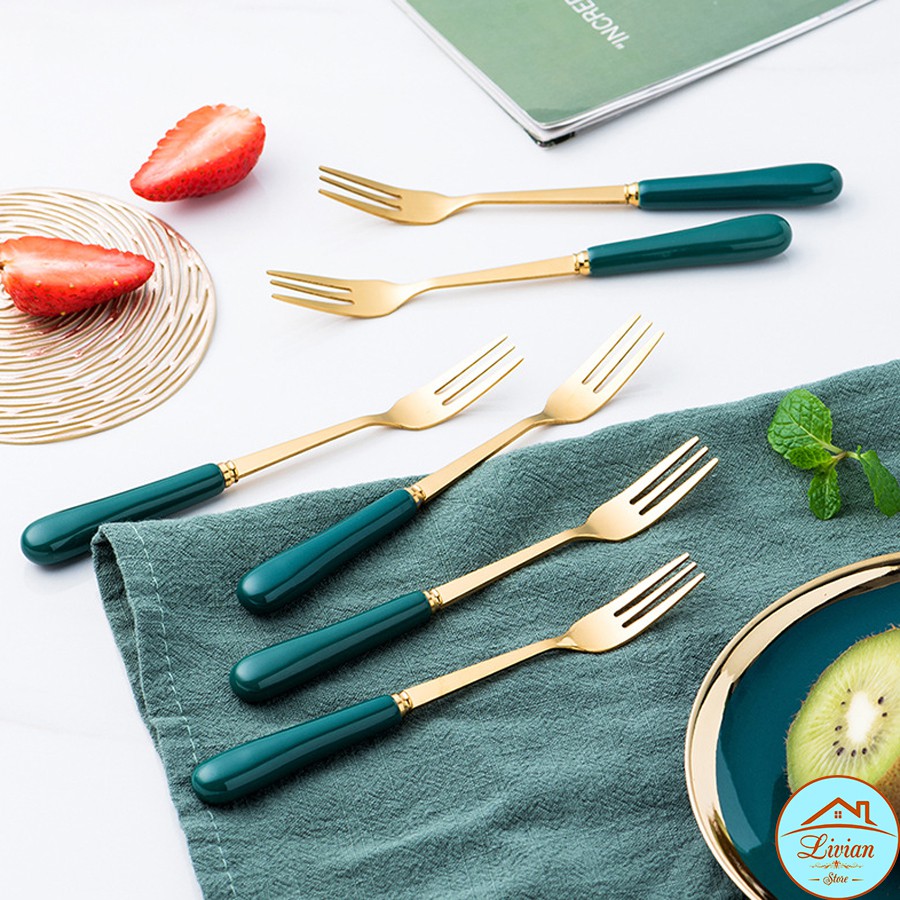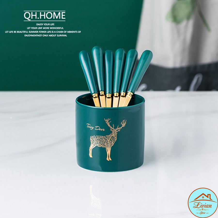 Nhà cửa & Đời sống > Bộ đồ bàn ăn > Dĩa || Lọ sứ đựng thìa dĩa, lọ đựng dĩa sứ xanh cổ vịt kèm 6 dĩa - giá mạ vàng sang trọngCòn hàng