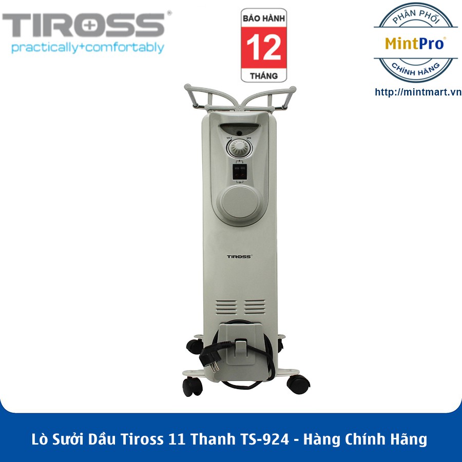***Ưu Điểm:Sưởi ấm và hong khô quần áoLò sưởi dầu Tiross 11 thanh TS-924 được thiết kế với 11 thanh phát nhiệt bọc dầu cùng công suất 2400W, có khả năng làm ấm nóng cho những diện tích vừa phải như phòng ngủ, phòng học, phòng khám… Ngoài ra, thiết kế có giá phơi giúp Tiross TS924 giống như 1 chiếc máy sấy khô quần áo trong ngày thời tiết ẩm hay mưa, đem lại cảm giác thật thơm tho sạch sẽ cho quần áo của bạn. Sản phẩm được các bà mẹ đặc biệt yêu thích vì rất hữu ích khi có thể nhanh chóng hong khô tã em bé vào mừa mưa.