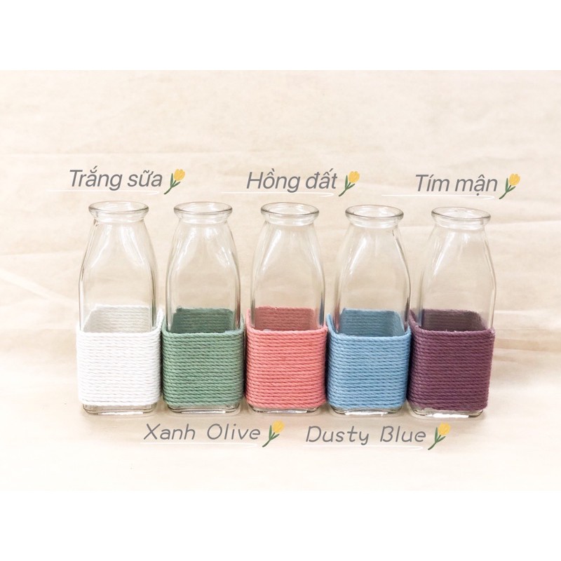 Lọ thủy tinh này tớ mua lẻ về tự quấn dây trang trí cho các cậu. Tớ ko sỉ chai lọ như các shop sỉ thủy tinh ạ! Nên mặt hàng này tính ra tớ mua hộ khách để cắm hoa chứ ko kinh doanh về thủy tinh T o TDây màu là dây mịn bằng cotton, không lẫn tạp chất (giặt được) nên đắt hơn dây thường nhiều ạ T o T