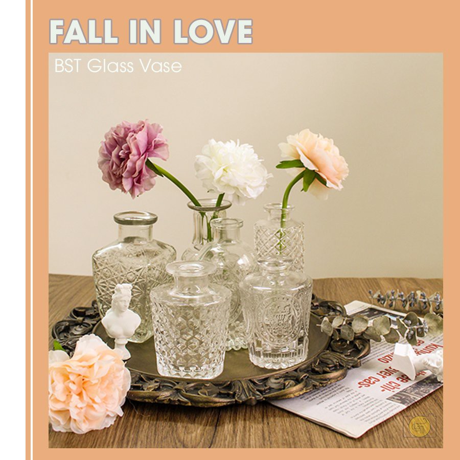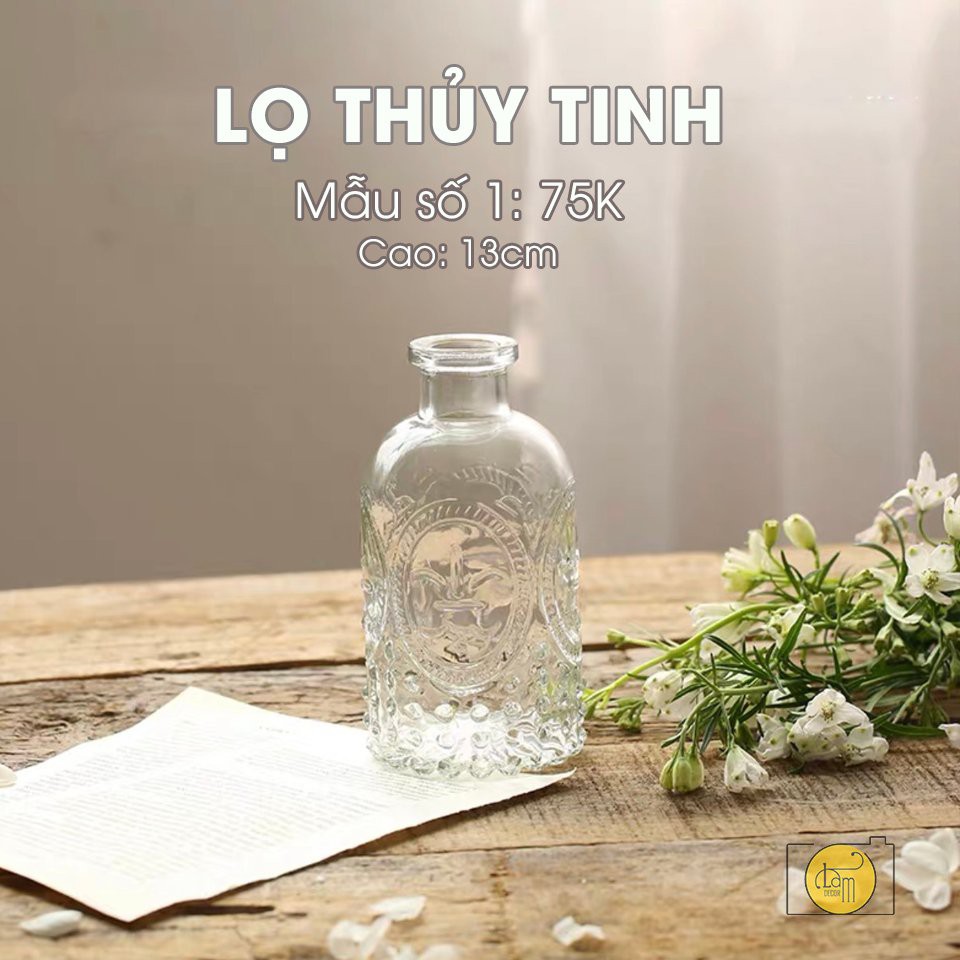 Những chiếc lọ thủy tinh đa dạng về kiểu dáng, chạm trổ hoa văn bắt mắt hình cánh hoa, chiều dọc, ô trám trở thành điểm nhấn bừng sáng cả bức hình sản phẩm.