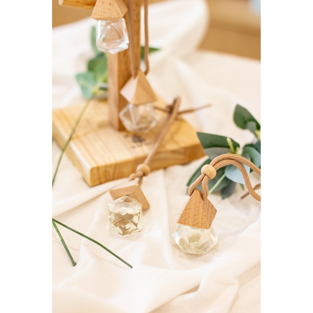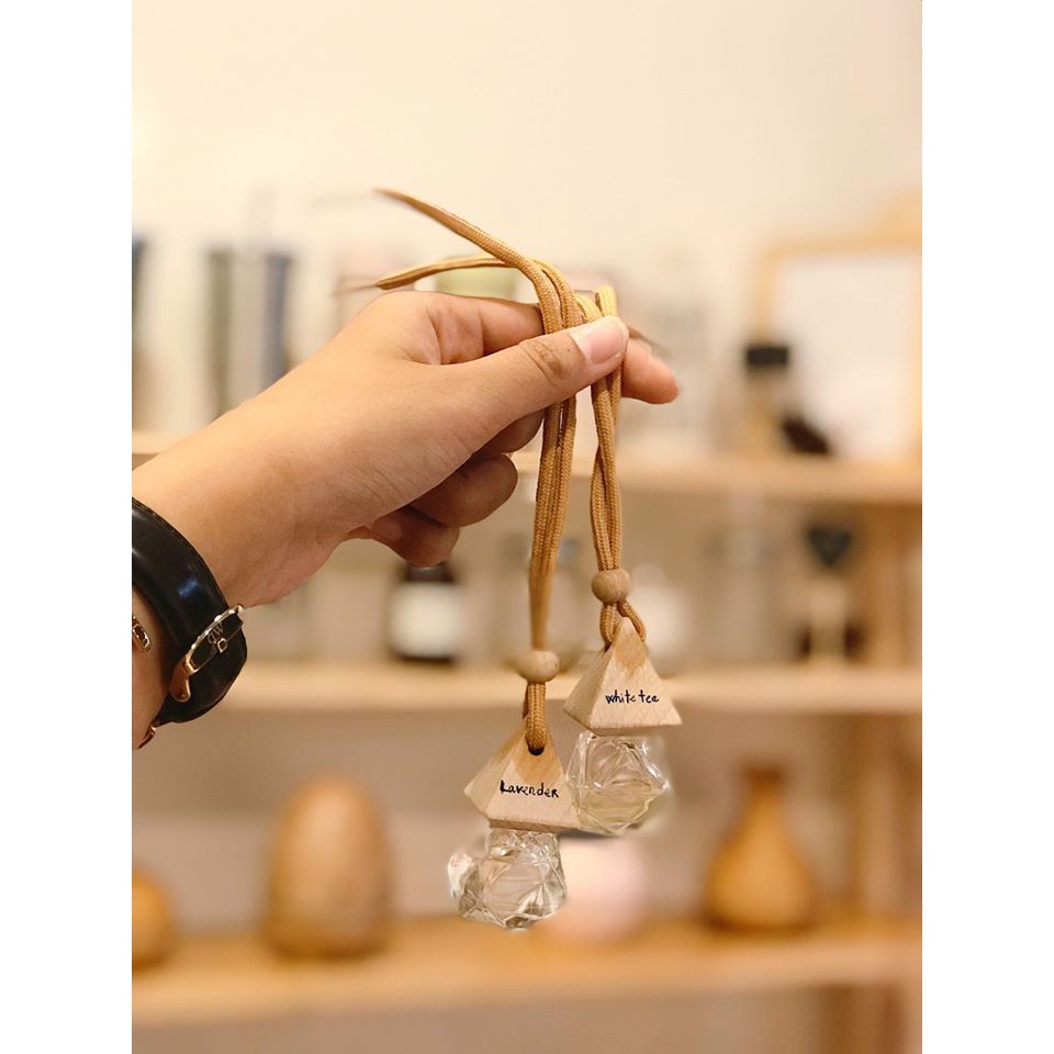 - Bước 3: Sau khi cho tinh dầu thấm vừa đủ, dùng 2 sợi dây ở đầu nắp gỗ để cột hoặc thoa vào những nơi có không gian nhỏ như xe hơi, tủ quần áo, …