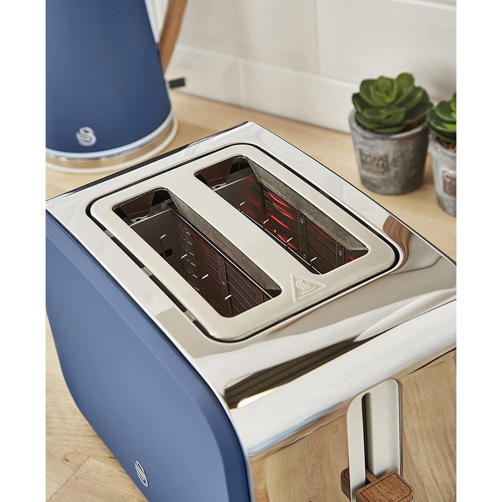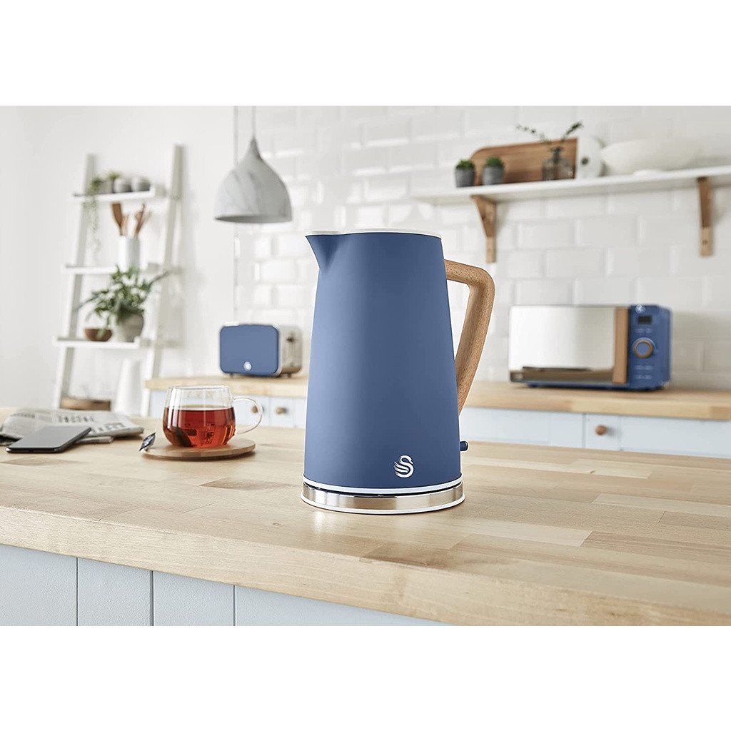 Bộ Lò vi sóng, ấm siêu tốc không dây, máy nướng bánh mì 2 lát SWAN Nordic tay cầm gỗ, hàng Anh, màu Matte Blue