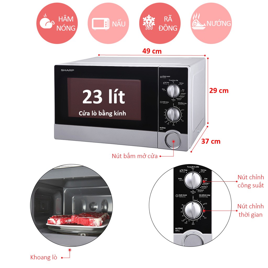 Giới thiệu Lò Vi Sóng Cơ Có Nướng Sharp 23 Lít Viba 800W Nướng 1000W - Bảo hành 12 tháng Chính Hãng