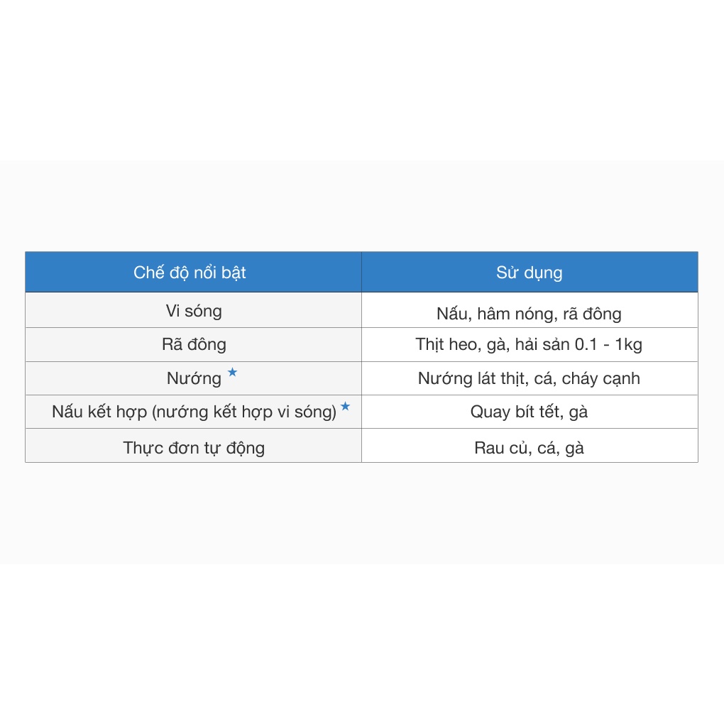 Chức năng chính: Rã đông, hâm, nấu, nướng