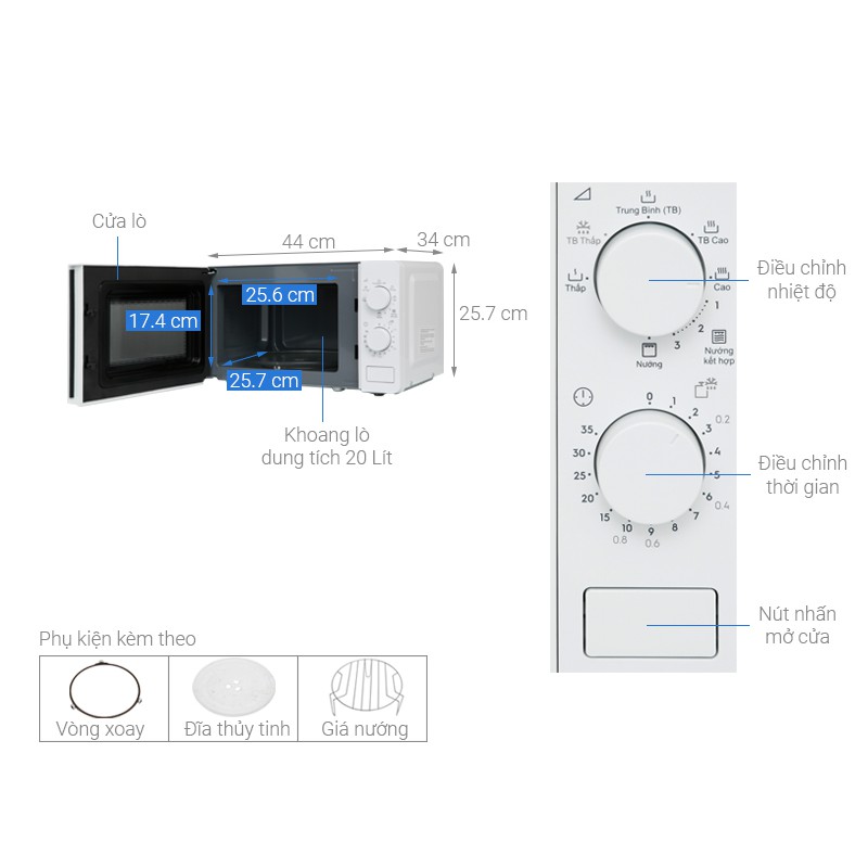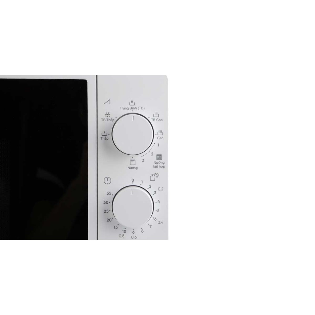 Lò vi sóng có bảng điều khiển núm vặn kèm hướng dẫn tiếng Việt dễ hiểu, cho người dùng thao tác tùy chỉnh các chức năng đơn giản, chính xác hơn