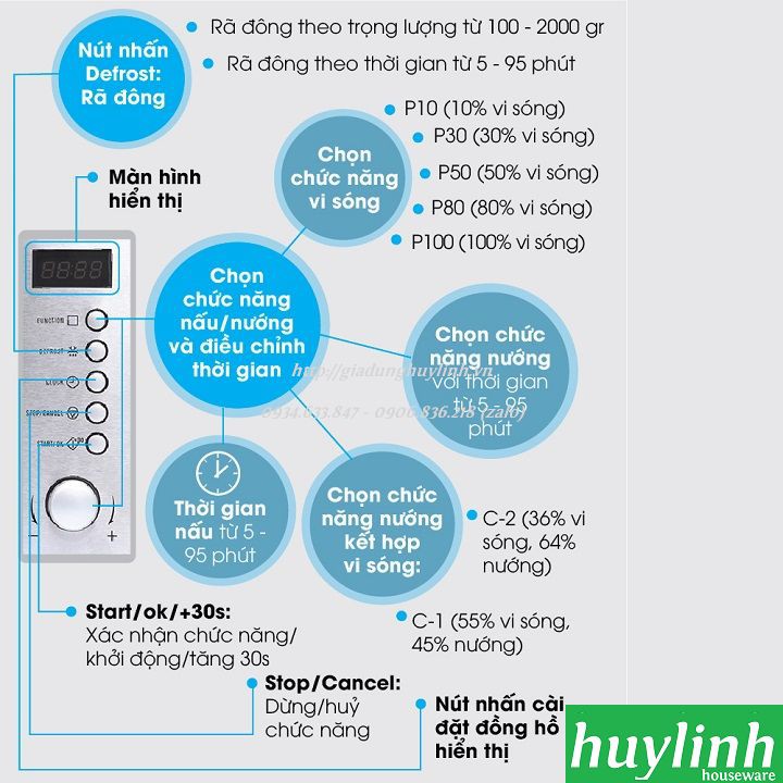 - Chức năng chính: Rã đông, hâm, nấu, nướng