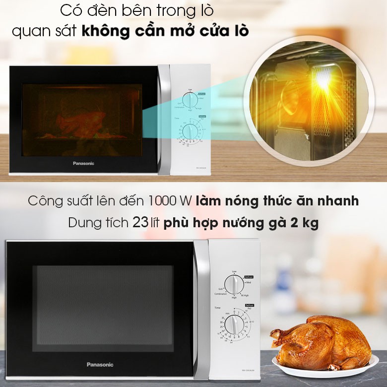 - Lò vi sóng có nướng với công suất vi sóng 800 W, công suất nướng 1000 W giúp nấu ăn nhanh chóng, tiết kiệm thời gian