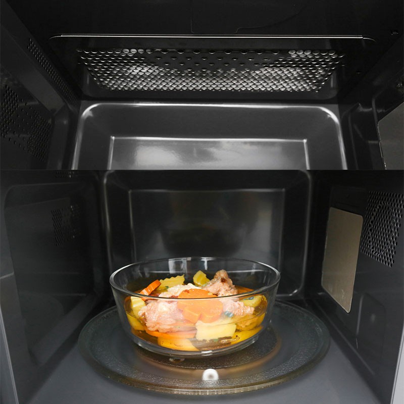 - Khoang lò vi sóng bằng thép không gỉ bền bỉ, hạn chế hoen rỉ, dễ vệ sinh sau khi dùng. Khoang lò rộng rãi có thể hâm được 1 tô canh lớn