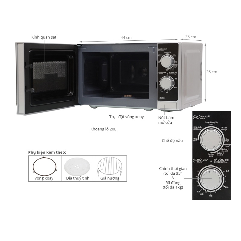 ✔ Công suất vi sóng: 800W, nướng 1000W