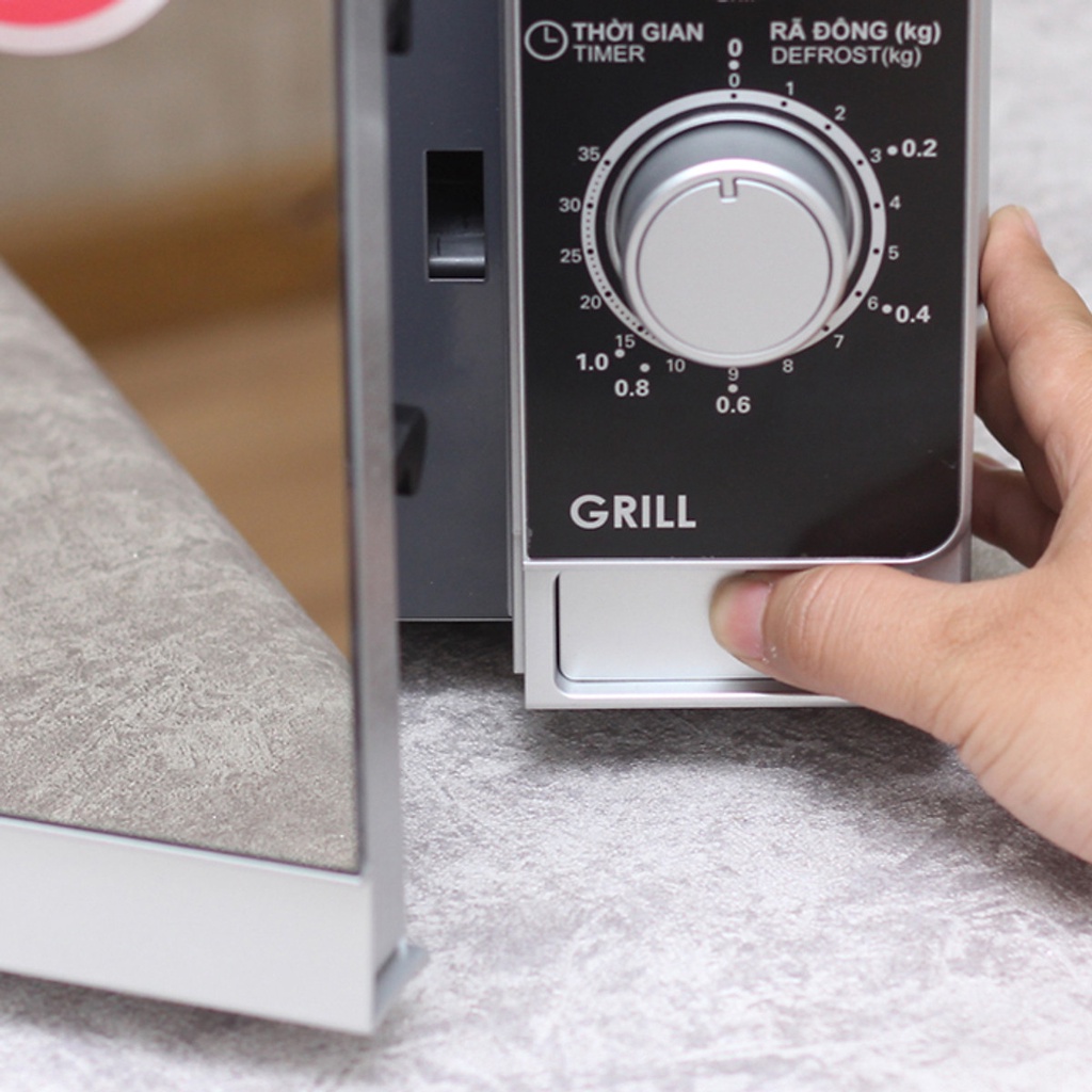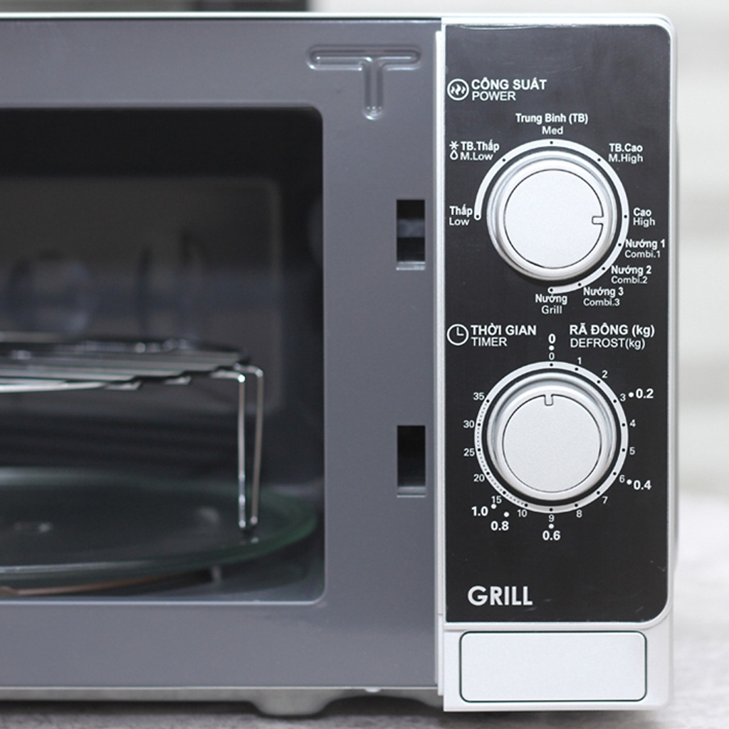 Lò vi sóng nướng cơ Sharp R-G223VN-SM có bảng điều khiển tiếng Việt dễ dùngLò vi sóng có nướng Sharp R-G223VN-SM được thiết lập 4 chức năng là nấu, hâm nóng, rã đông và nướng cùng 5 mức công suất khác nhau, công suất vi sóng tối đa là 800W, công suất nướng là 1000W giúp bạn chế biến các món ăn tiện lợi, dễ dàng, không mất nhiều công sức, thời gian.