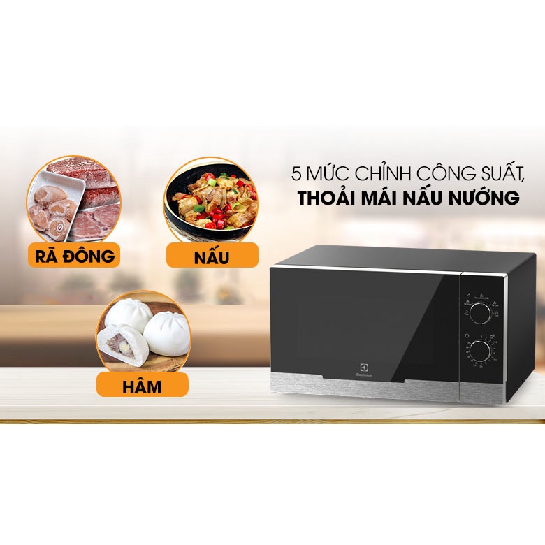 Lò vi sóng Electrolux cơ bản sử dụng nấu, hâm nóng, rã đông, với 5 mức công suất tùy chỉnh bằng núm xoay đơn giản, tiện lợi, dễ dùng cho mọi người