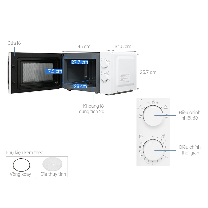 Tiện ích: Chuông báo khi nấu xong. Hẹn giờ lên tới 35 phút. Khoang lò có đèn