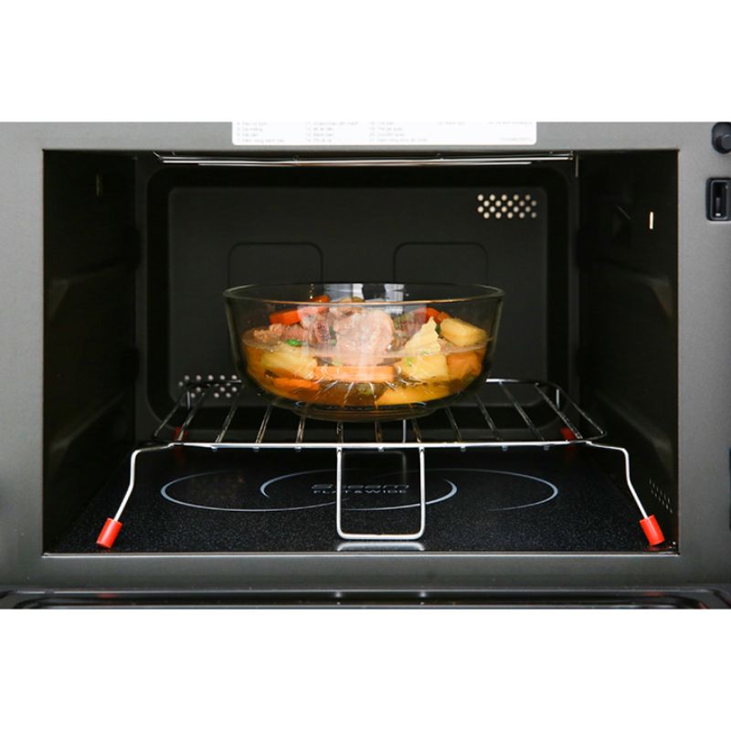 Đa chức năng nấu tiện lợi: hâm nóng, nấu, rã đông, hấp tự động với công suất vi sóng 1000 W, chức năng nướng với khay nướng thạch anh cho công suất đến 1200 W nướng ngon và an toàn