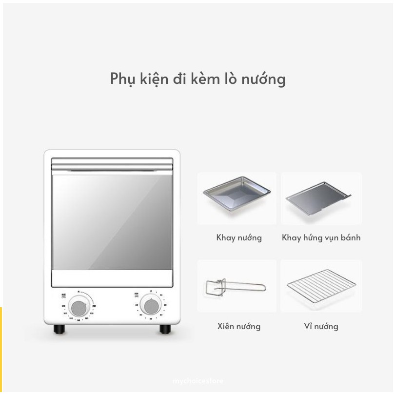 * - Phụ kiện đi kèm gồm: 1 khay nướng, 1 vỉ nướng, 1 xiên nướng, 1 khay hứng mỡ/vụn bánh