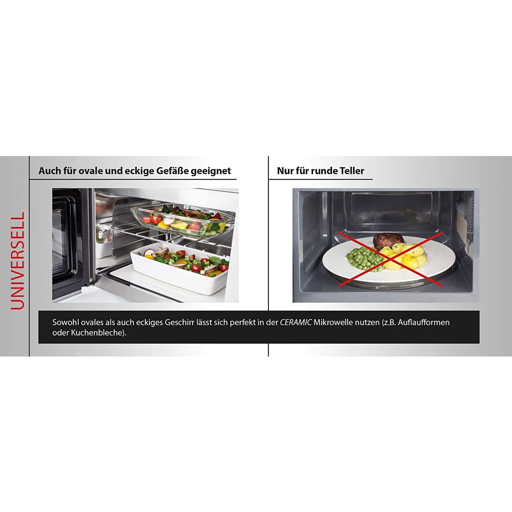 + Nhờ đế gốm phẳng với gương phản xạ vi sóng, bàn xoay thủy tinh không còn cần thiết nữa. Lý tưởng cho các món nướng vuông.