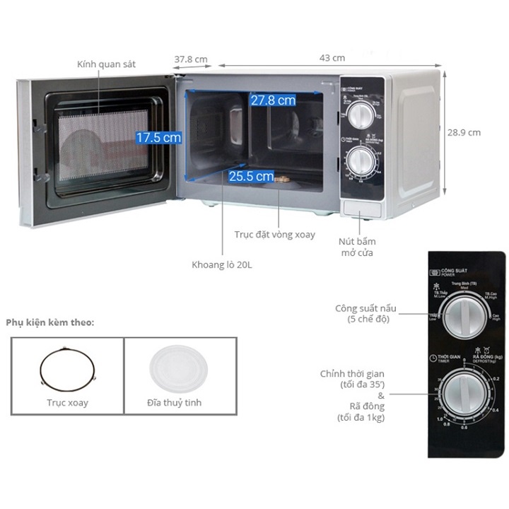 + Khoang lò dung tích 20 lít, có đĩa xoay thủy tinh