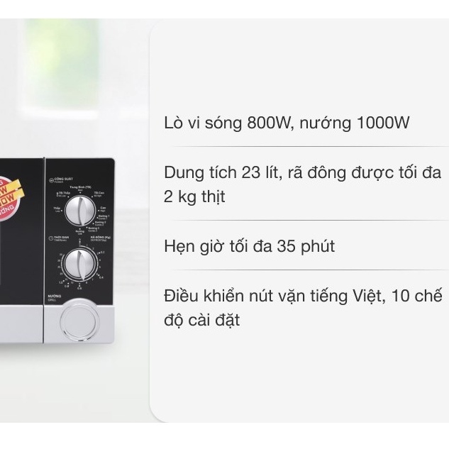 - 4 chức năng sử dụng: nấu, hâm nóng, rã đông, nướng với công suất vi sóng đến 800 W, riêng chức năng nướng hoạt động với công suất đến 1000 W, hỗ trợ phục vụ các món nướng đơn giản cho gia đình.