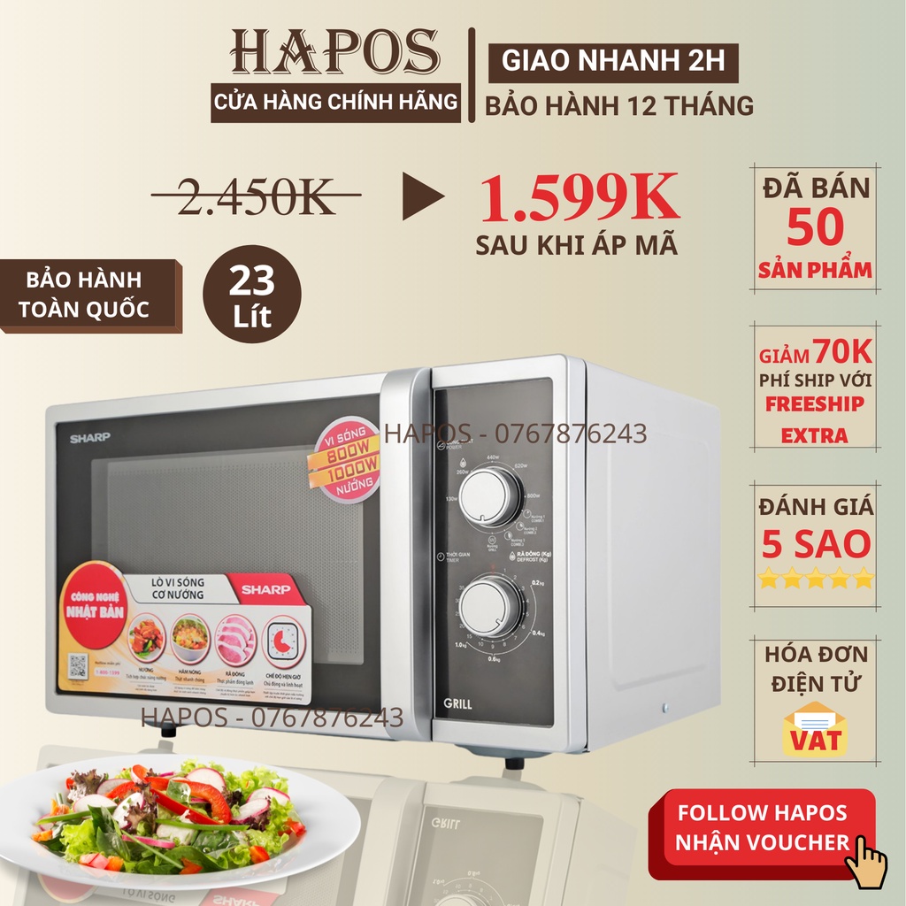 Thiết Bị Điện Gia Dụng > Đồ gia dụng nhà bếp > Lò vi sóng || [Mã ELHADEV giảm 4% đơn 300K] Lò vi sóng cơ Sharp 23 lít có nướng viba 800W nướng 1000W núm xoay cơ - HAPOSCòn hàng