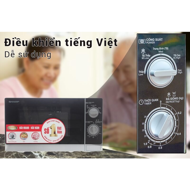 Cụm điều khiển vặn xoay có tiếng Việt chỉ dẫn trên từng nút, giúp hạn chế thao tác sai. Cho nên lò vi sóng Sharp R-205VN(S) hoàn toàn thân thiện với người sử dụng cho dù có là người lớn tuổi