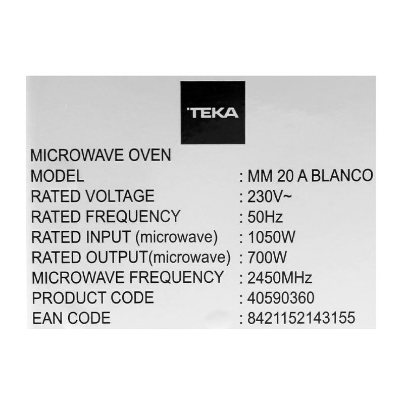 Thông số kỹ thuật Lò vi sóng TEKA MM 20 A BLANCO 20 lít