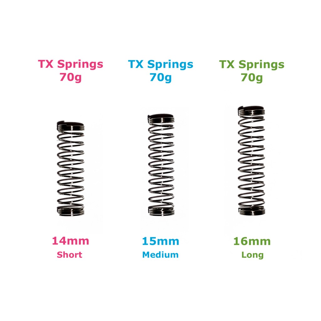 Lò xo thay thế dùng cho switch trên bàn phím cơ.TX sẽ không dùng các từ như “slow curved” hay “progressive” để đặt tên cho lò xo của mình. Họ gọi nó là Short, Medium và Long, giúp người dùng có cái nhìn trực quan và dễ hiểu hơn.