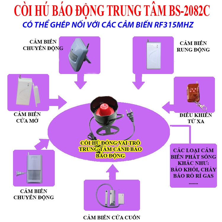 Lưu ý: Bộ sản phẩm bao gồm 1 loa trung tâm BS-2082C + 1 tay điều khiển RF315Mhz + cảm biến cửa mở RF315Mhz. Ngoài ra bạn có thể mua thêm các loại cảm biến phát sóng RF315Mhz khác để ghép nối với loa trung tâm để đa dạng hóa hệ thống an ninh cho gia đình bạn.Loa báo động trung tâm không dây BS-2082C điều khiển bằng cách kết hợp với các loại tay điều khiển RF 315Mhz và hú báo động khi ghép nối với các loại cảm biến phát sóng không dây 315Mhz…