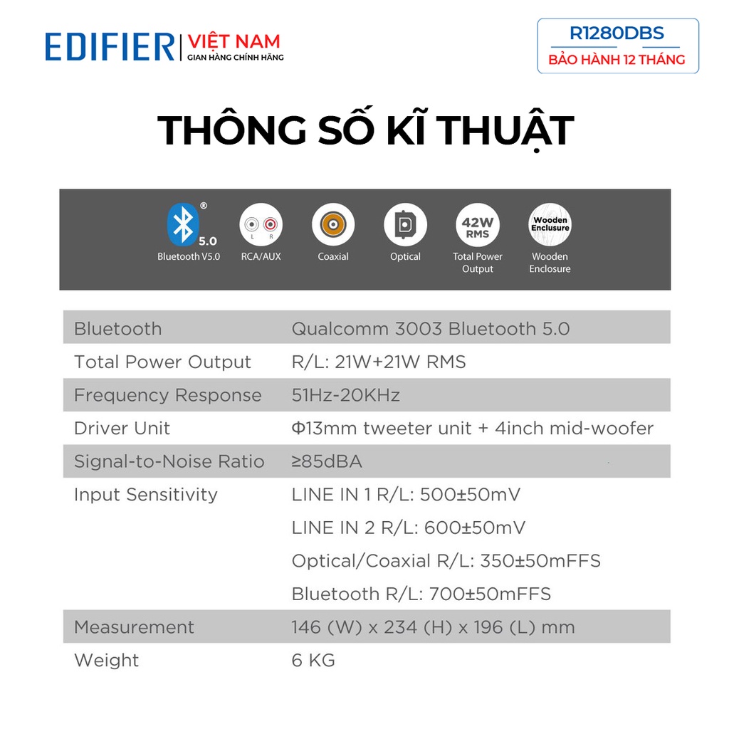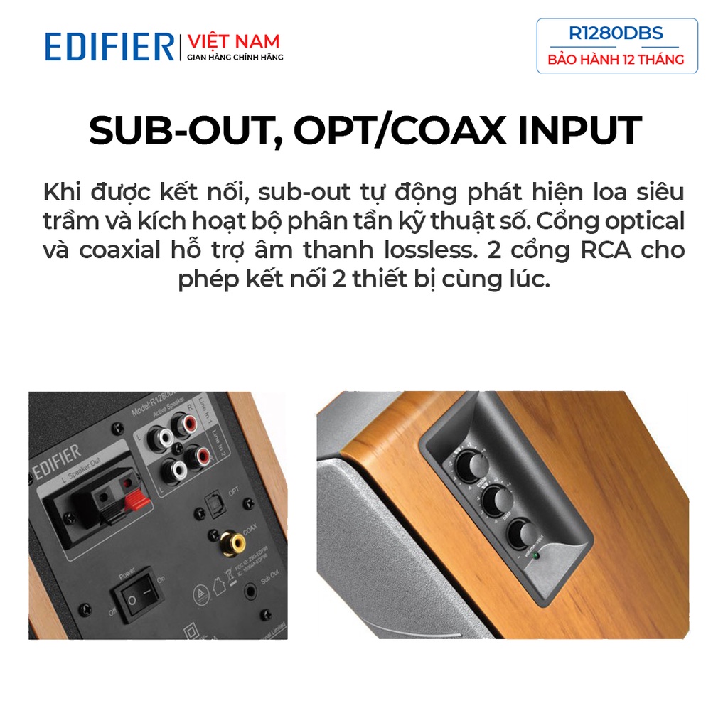 - Đa dạng cổng kết nối: Optical/Coaxial để kết nối với Smart TV. Hai ngõ RCA (bông sen) để kết nối tới nguồn phát analog như CD/DVD, ngõ cắm 3.5mm trên máy tính, điện thoại. Kết nối đặc biệt thú vị trên R1280DBs là cổng Sub-Out để kết nối tới loa siêu trầm, ví dụ loa siêu trầm Edifier T5.
