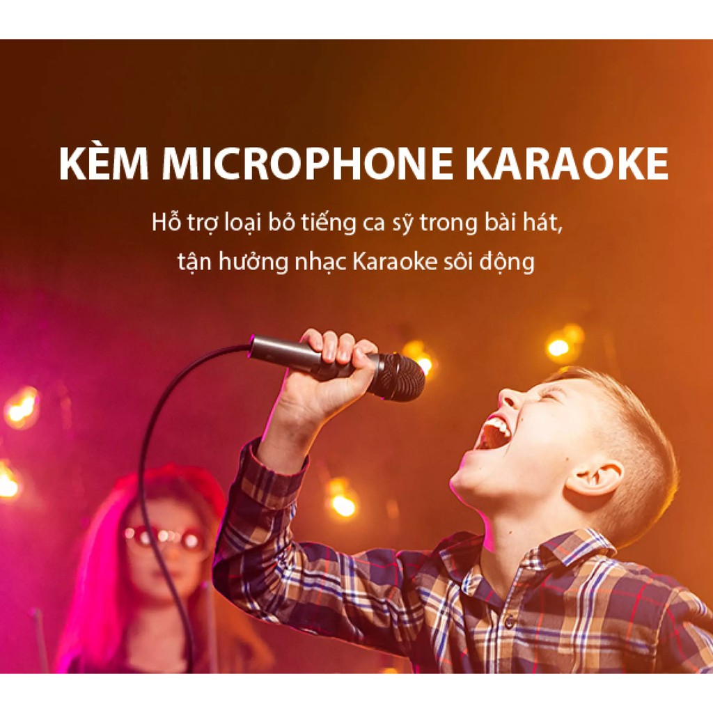 - Loa đi kèm Micro Karaoke, hỗ trợ loại bỏ tiếng ca sĩ trong bài hát, tận hưởng các bài hát karaoke sôi động.